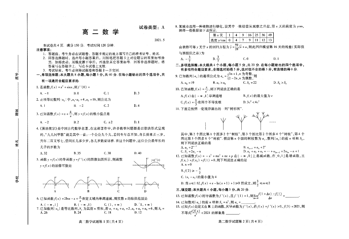 山东省潍坊市2021.5高二期中统一检测试题数学