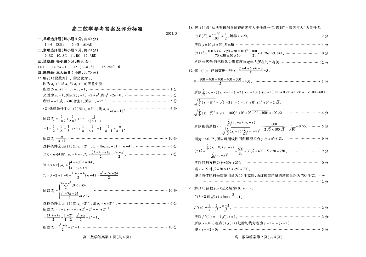 山东省潍坊市2021.5高二期中统一检测试题数学答案