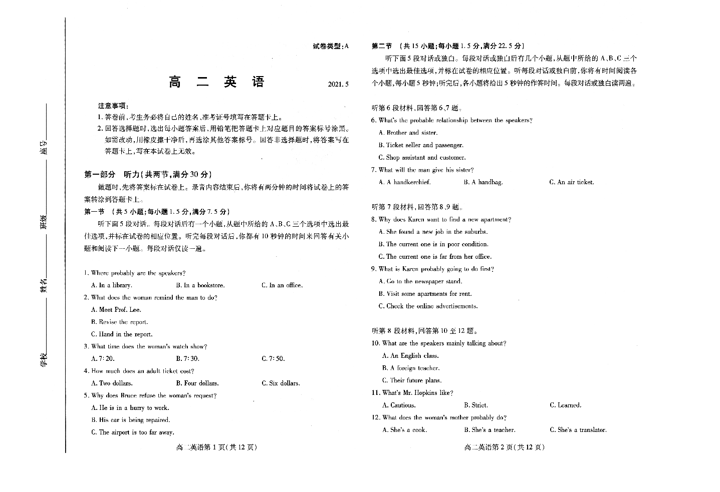 山东省潍坊市2021.5高二期中统一检测试题英语