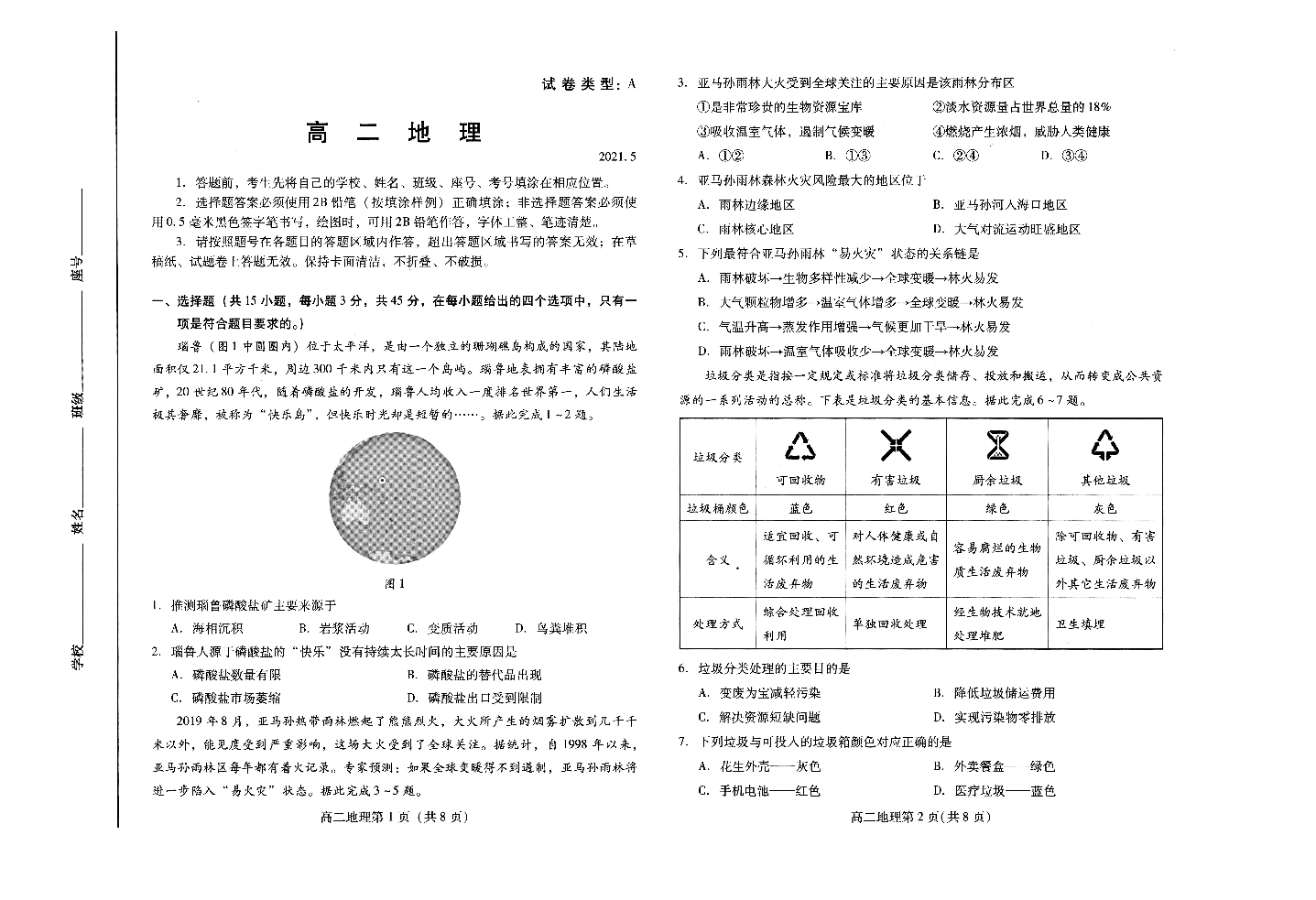 山东省潍坊市2021.5高二期中统一检测试题地理