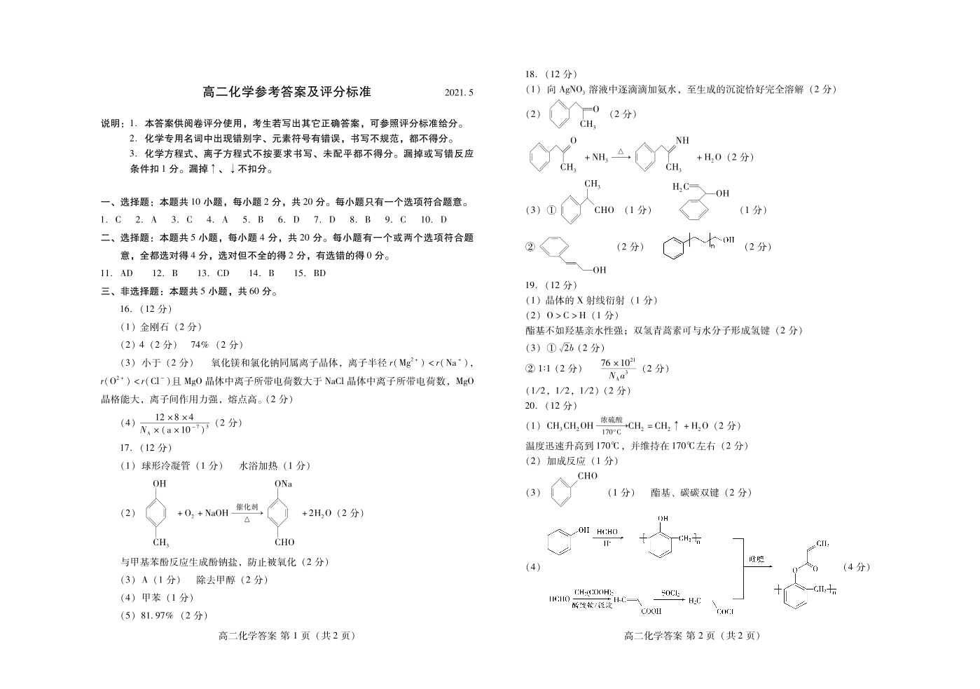 山东省潍坊市2021.5高二期中统一检测试题化学答案