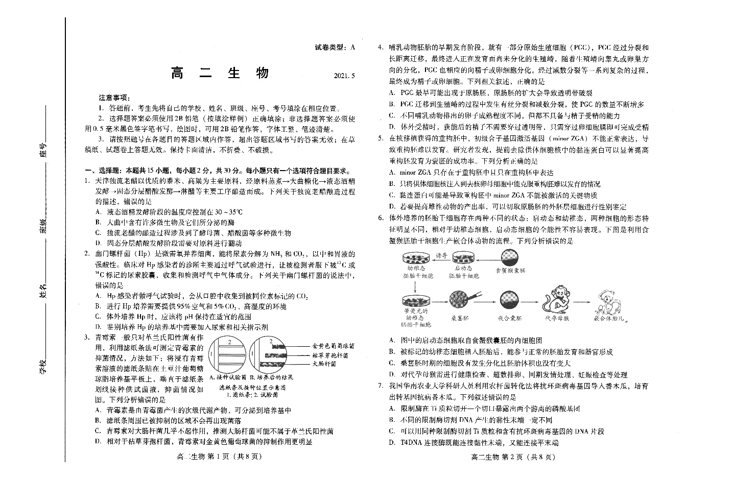 山东省潍坊市2021.5高二期中统一检测试题生物