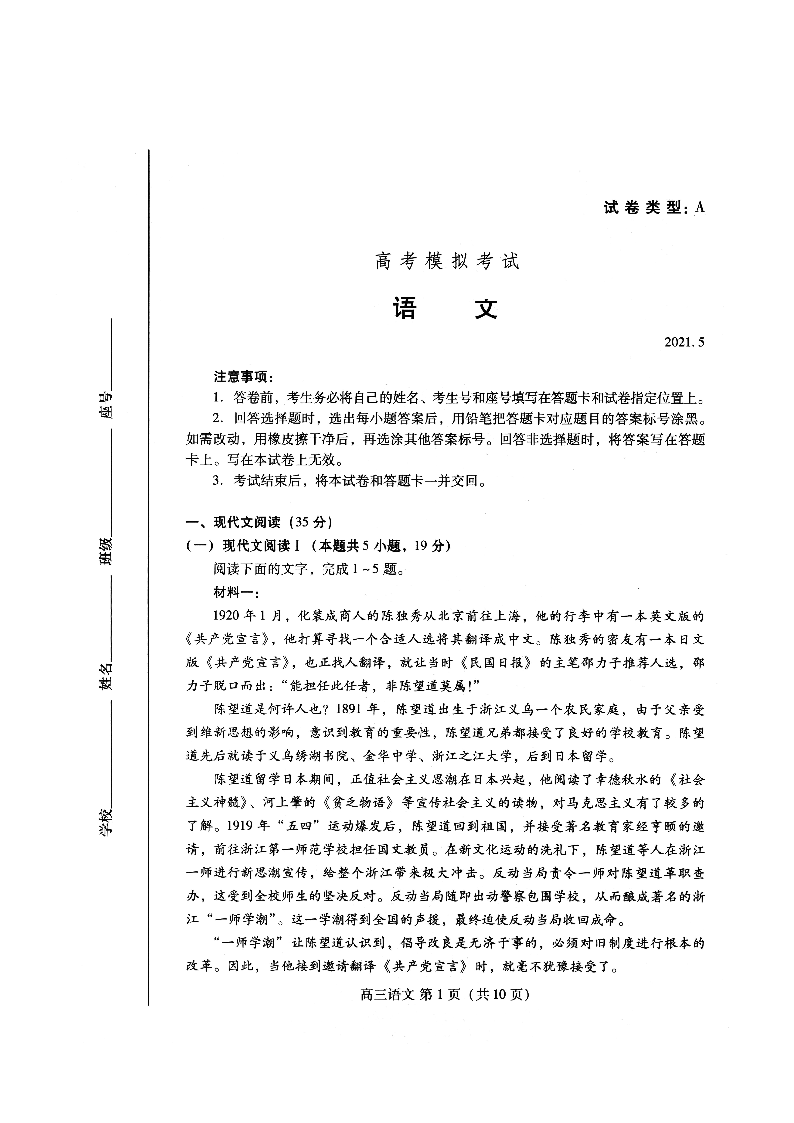 山东省潍坊市2021.5高三第三次模拟考试语文