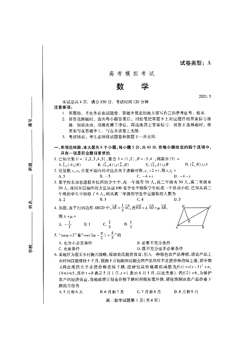 山东省潍坊市2021.5高三第三次模拟考试数学