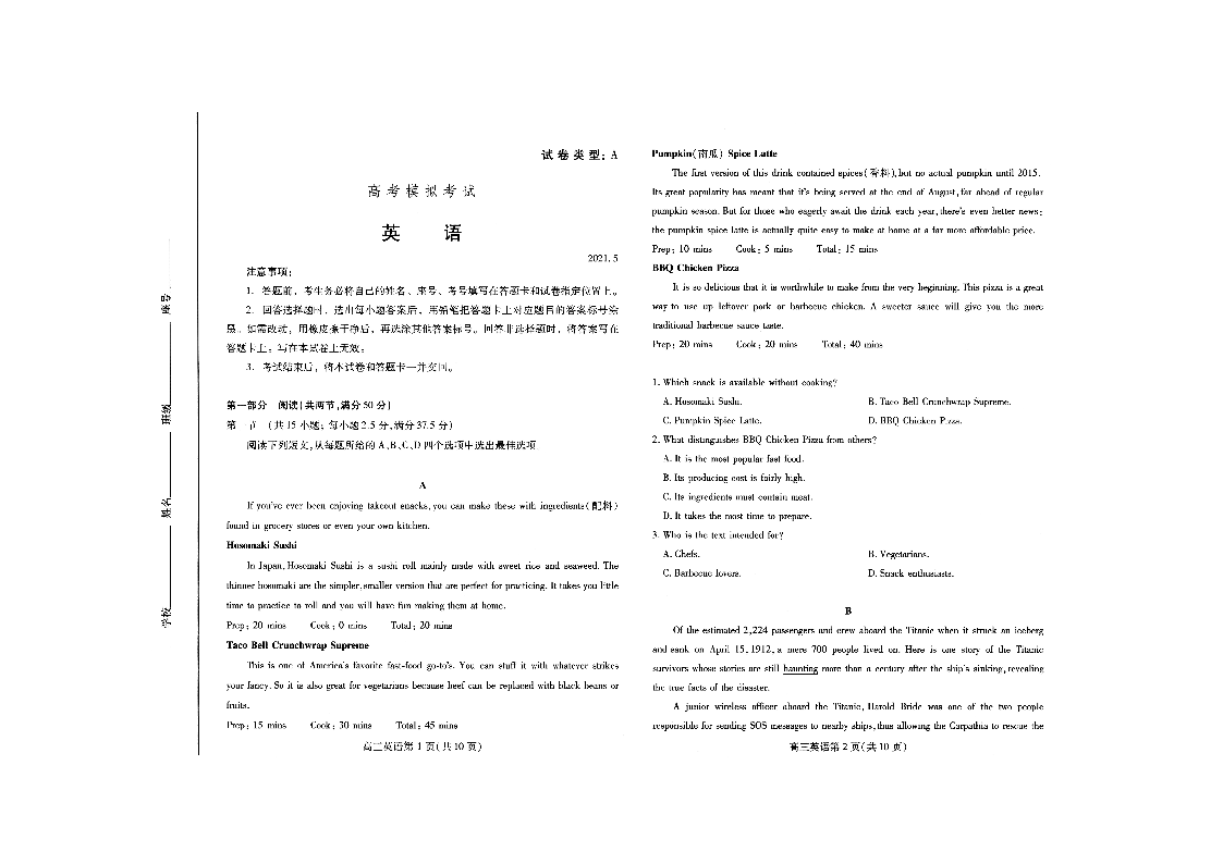 山东省潍坊市2021.5高三第三次模拟考试英语