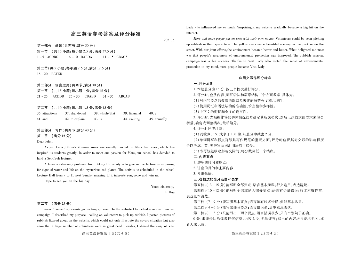 山东省潍坊市2021.5高三第三次模拟考试英语答案