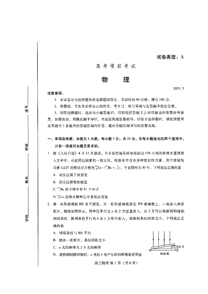 山东省潍坊市2021.5高三第三次模拟考试物理