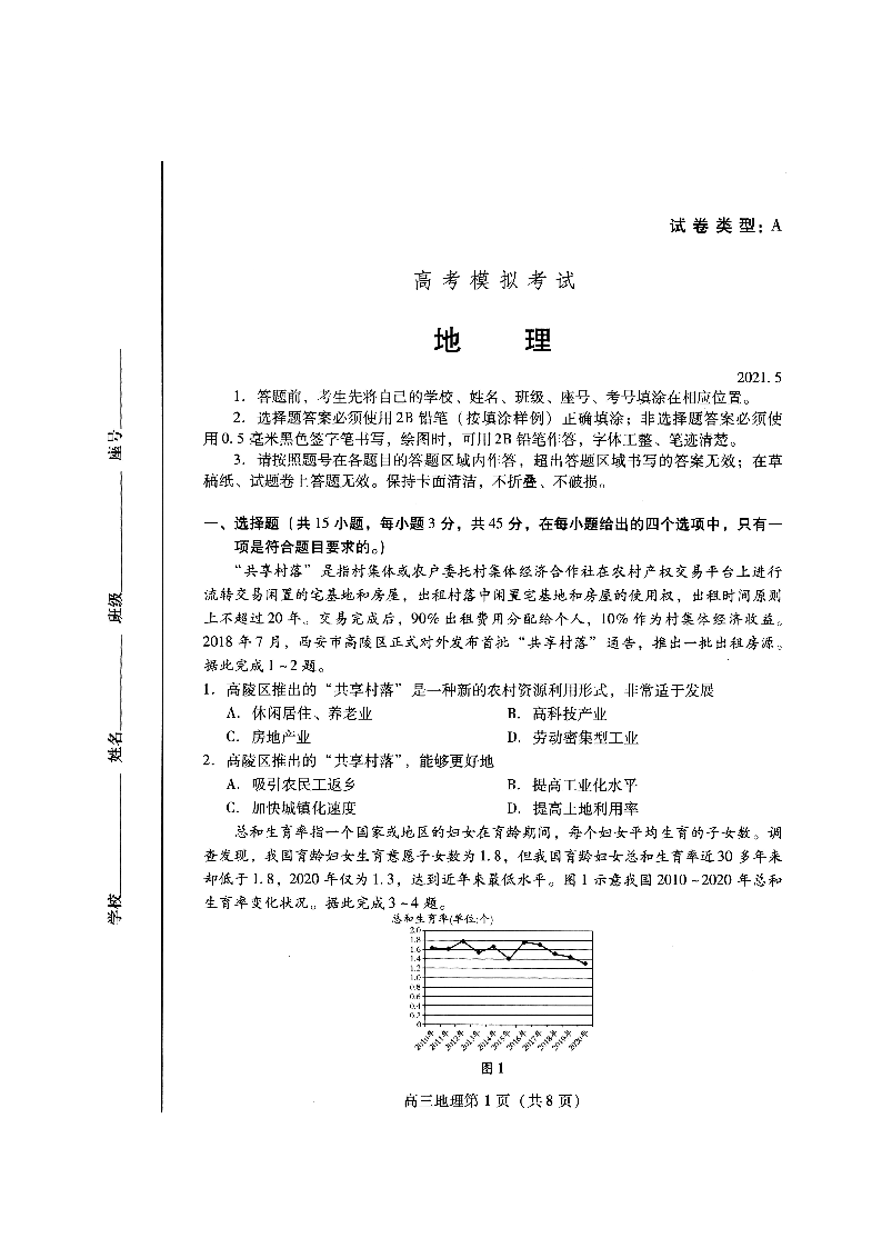 山东省潍坊市2021.5高三第三次模拟考试地理