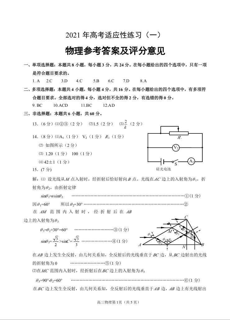山东省烟台市2021.5高三第二次模拟考试物理答案