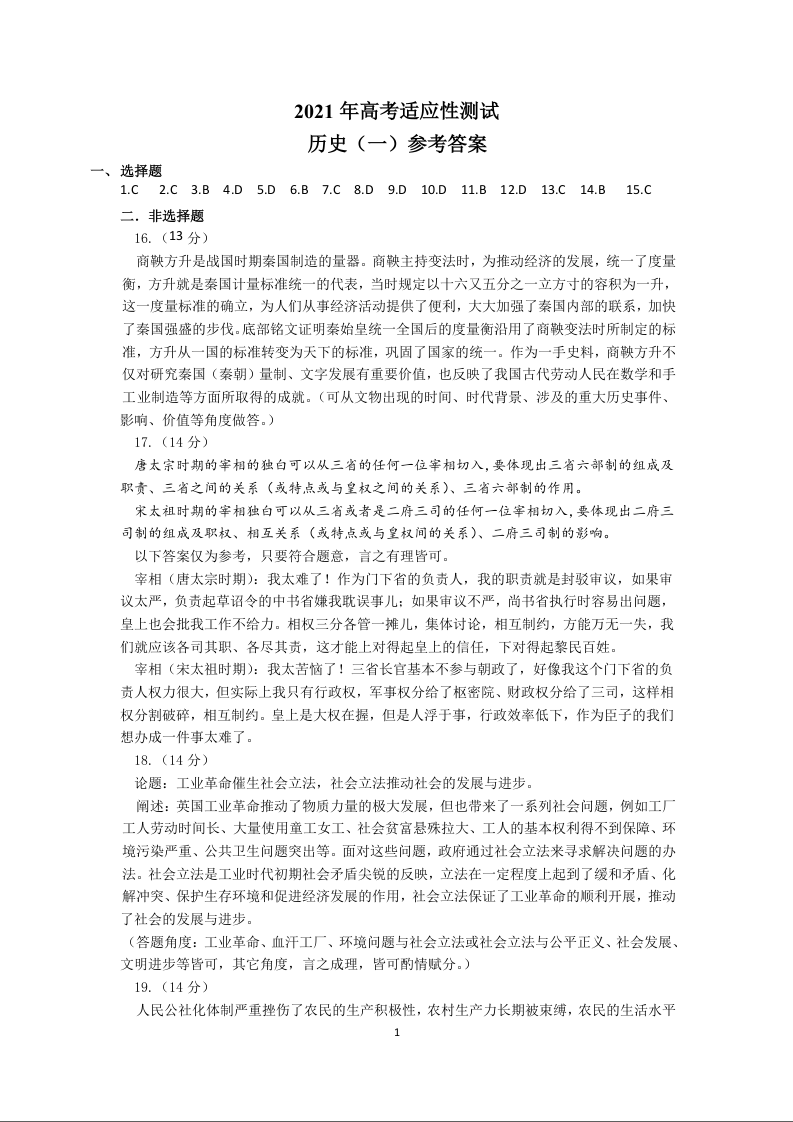 山东省烟台市2021.5高三第二次模拟考试历史答案