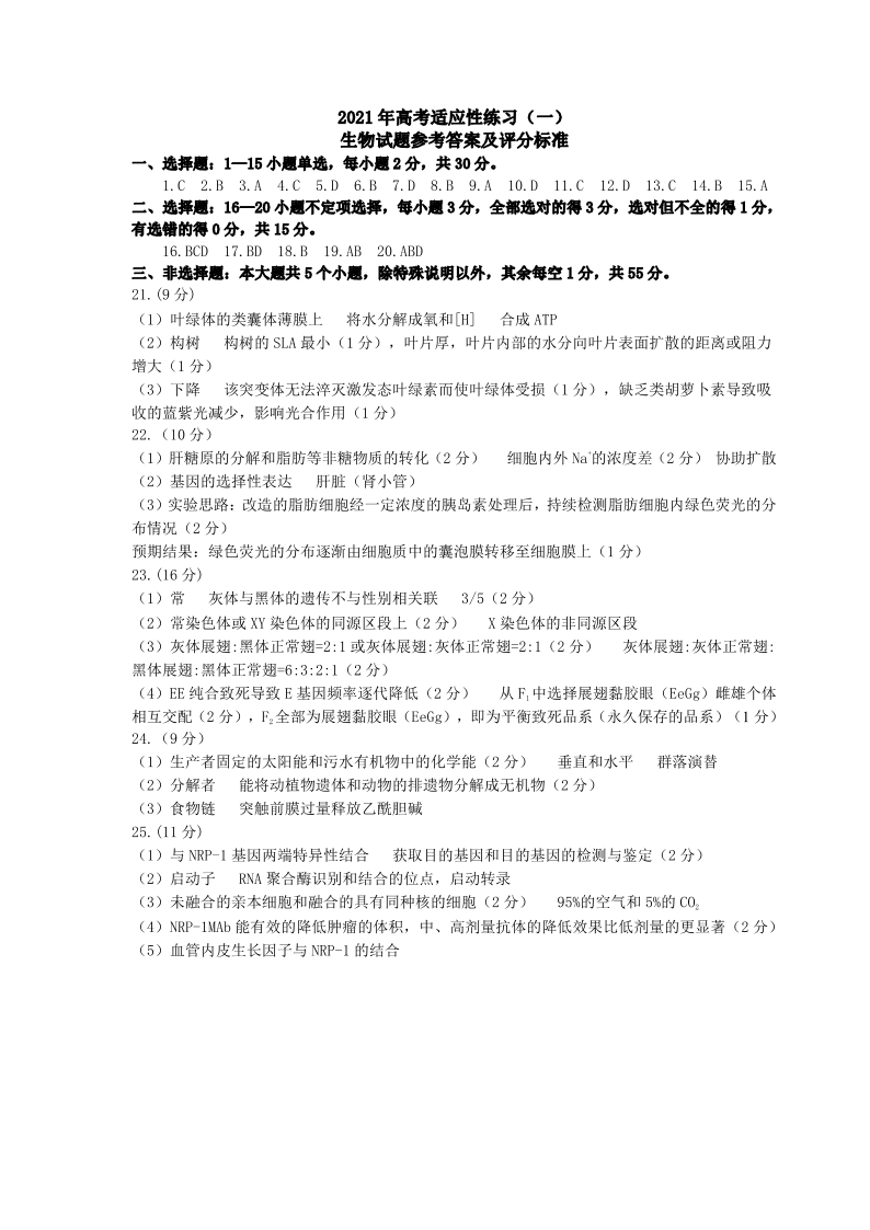 山东省烟台市2021.5高三第二次模拟考试生物答案
