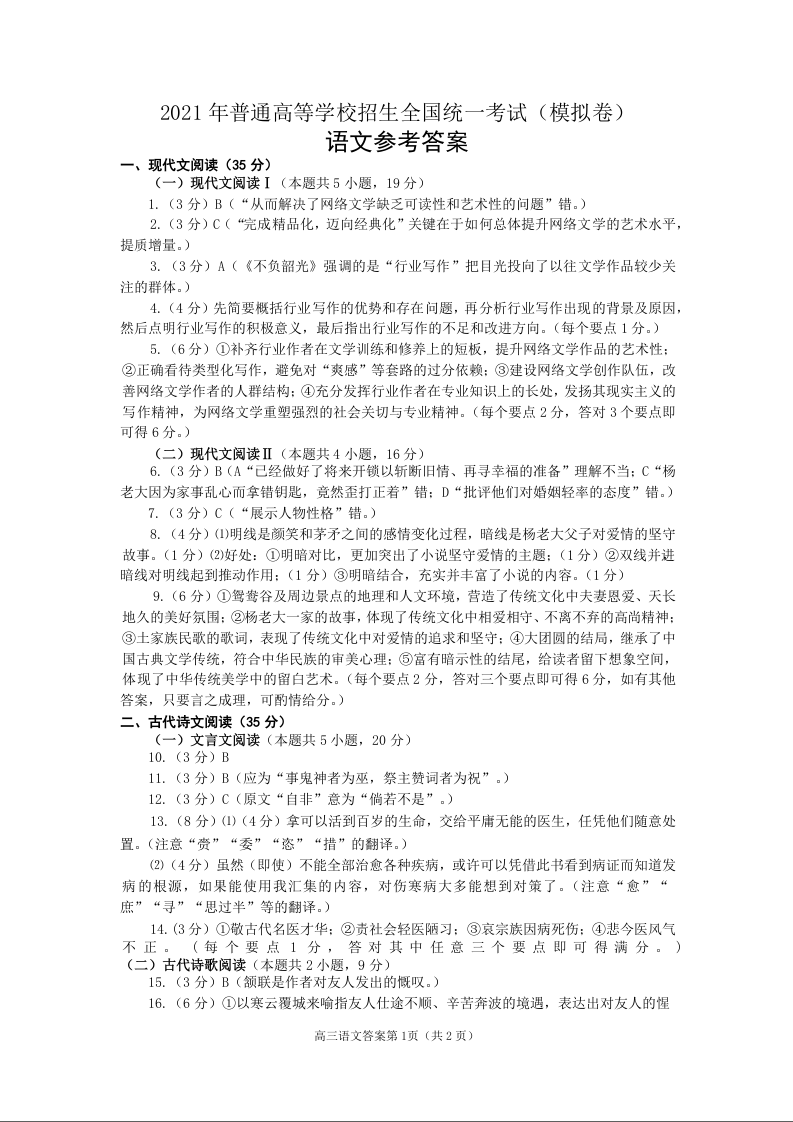 山东省烟台市2021.5高三第三次模拟考试语文答案