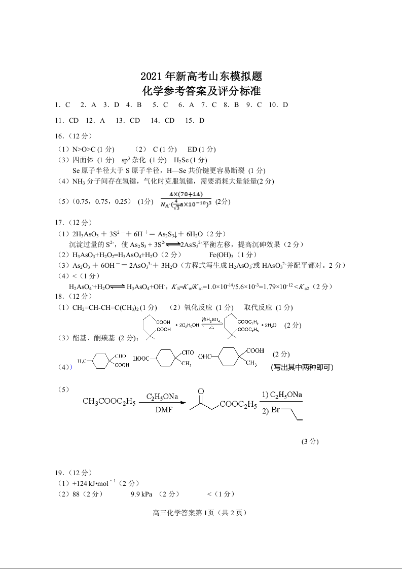 山东省烟台市2021.5高三第三次模拟考试化学答案