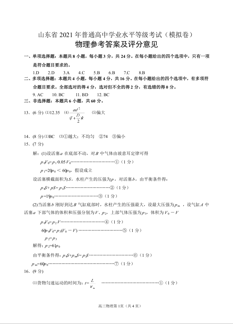 山东省烟台市2021.5高三第三次模拟考试物理答案