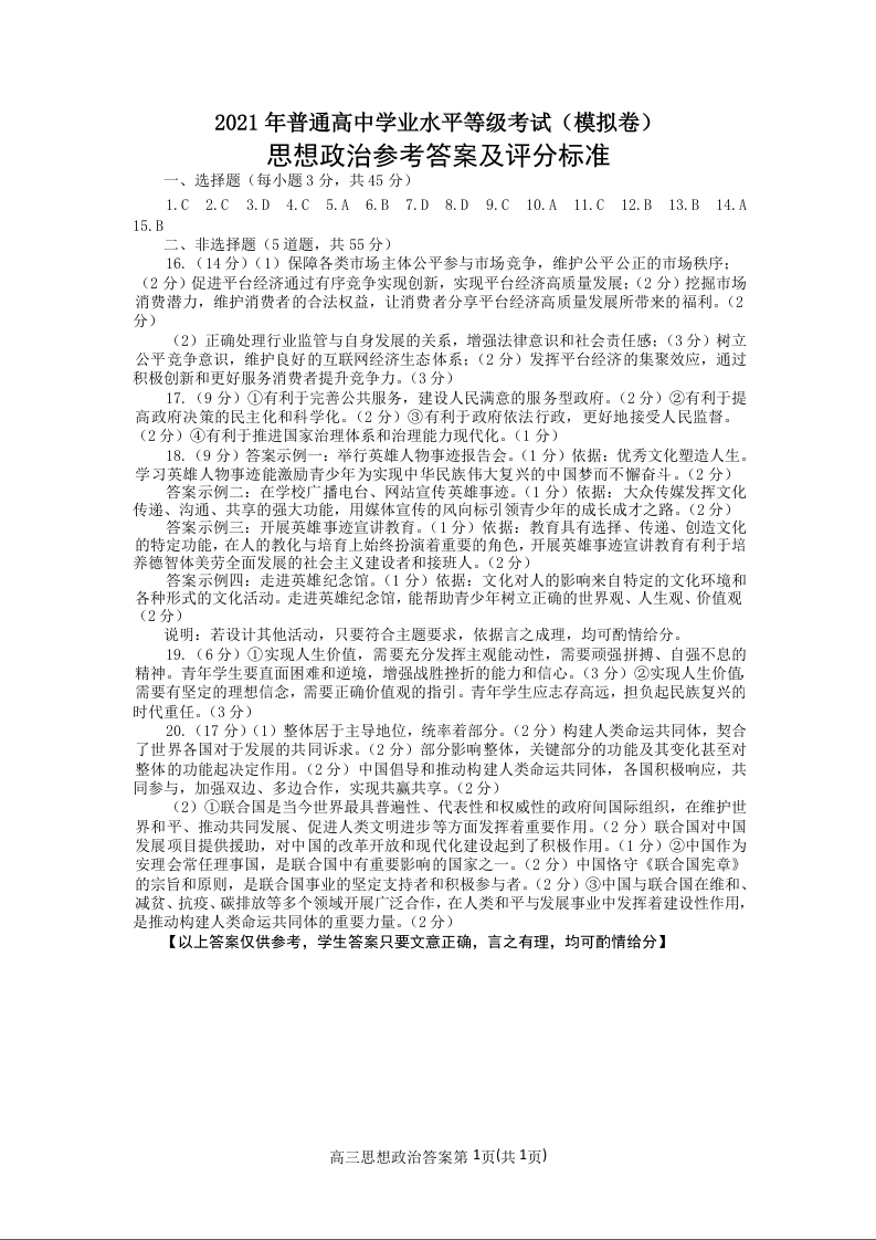 山东省烟台市2021.5高三第三次模拟考试政治答案