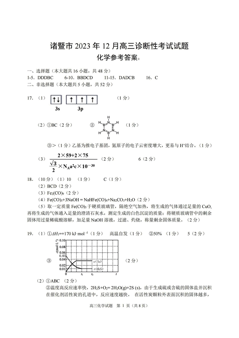 浙江省诸暨市2023年12月高三适应性考试 化学参考答案