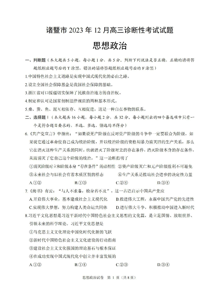 浙江省诸暨市2023年12月高三适应性考试 政治