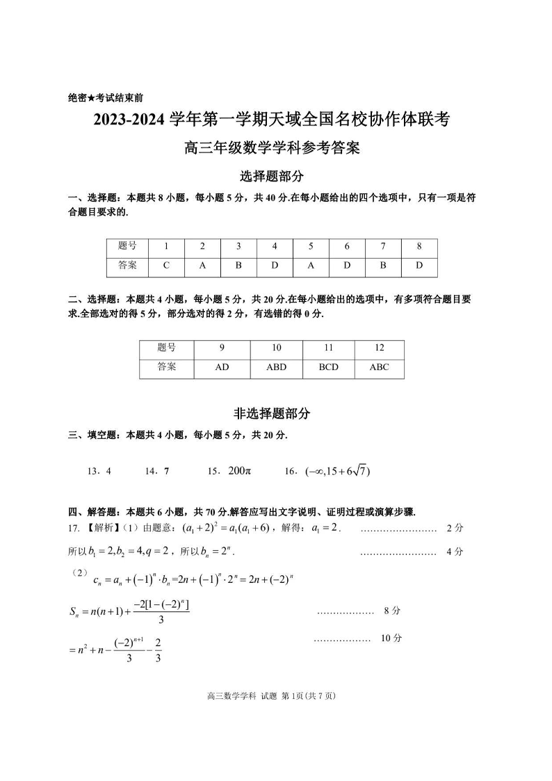2023-2024学年第一学期天域全国名校协作体联考 数学答案