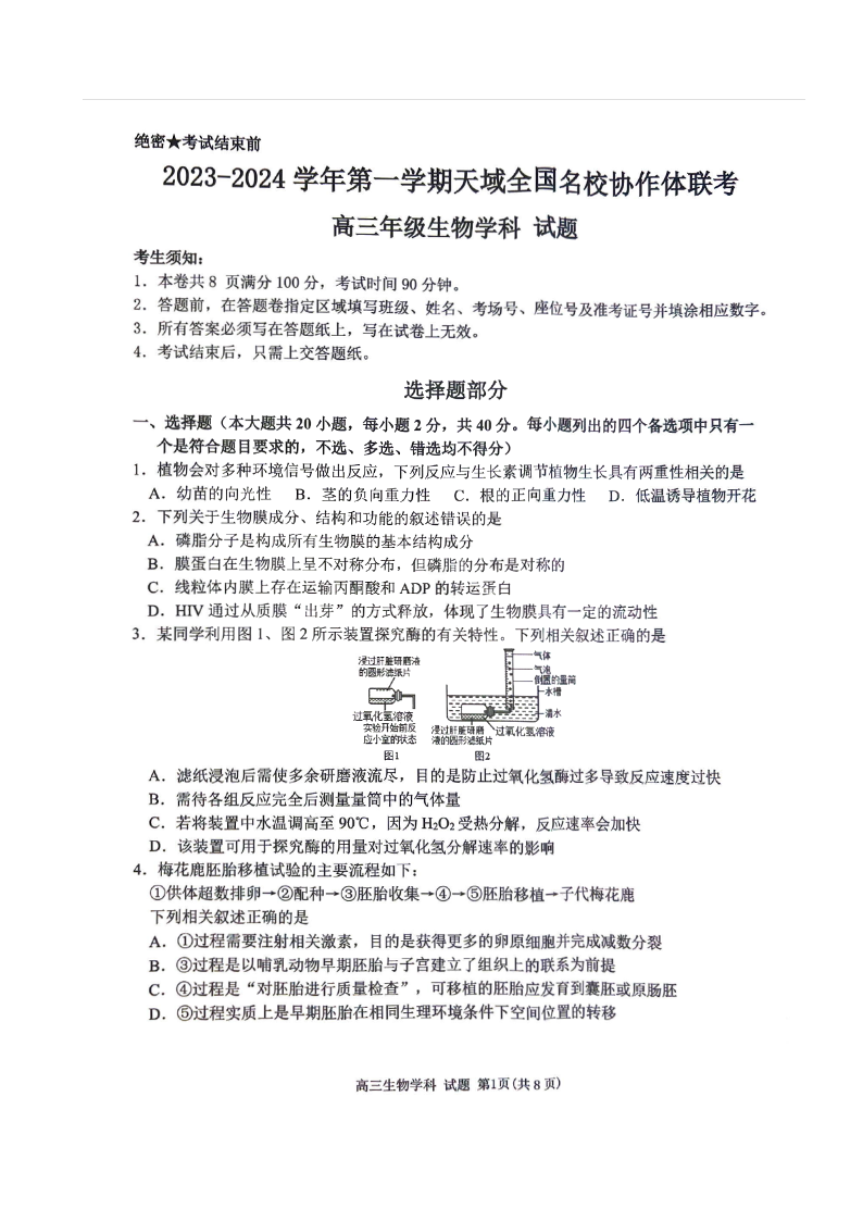 2023-2024学年第一学期天域全国名校协作体联考 生物