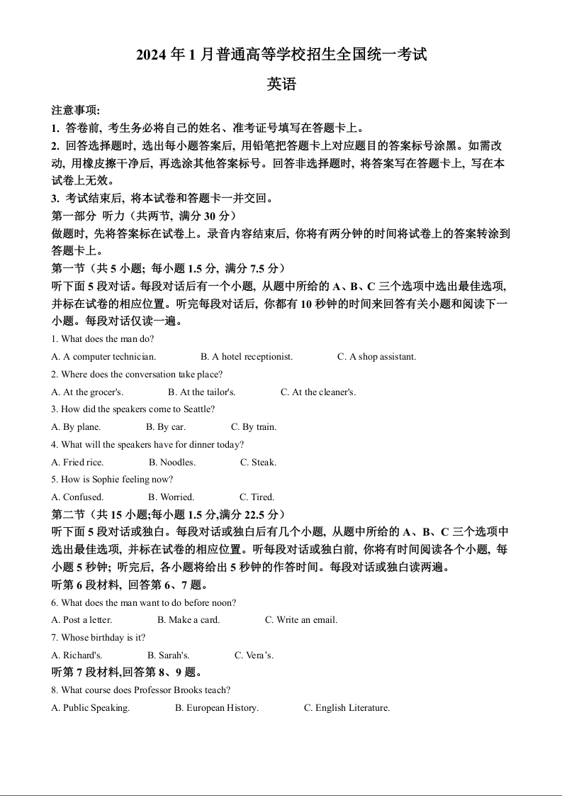 2024年1月浙江省普通高校招生选考科目考试 英语