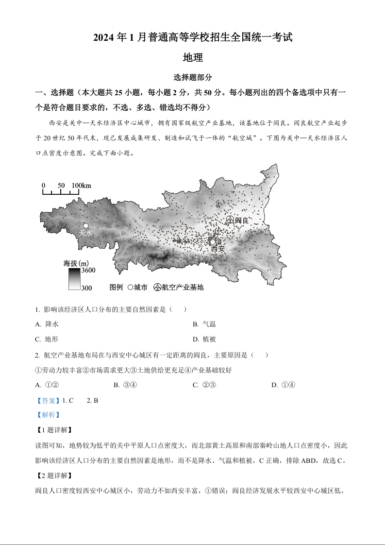 2024年1月浙江省普通高校招生选考科目考试 地理答案