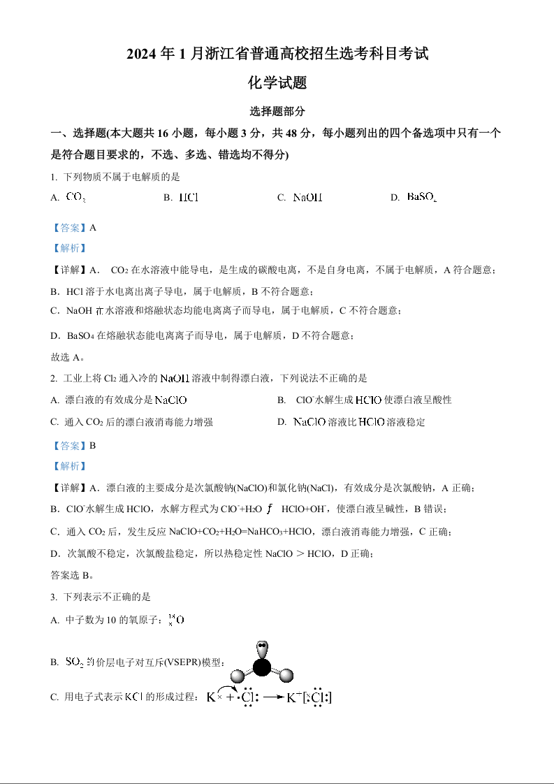 2024年1月浙江省普通高校招生选考科目考试 化学答案