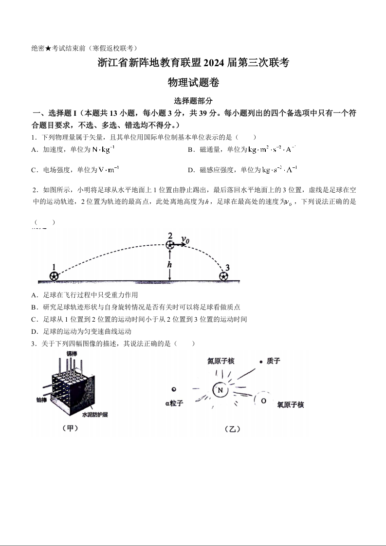 浙江省新阵地教育联盟2023-2024学年高三下学期开学考试 物理