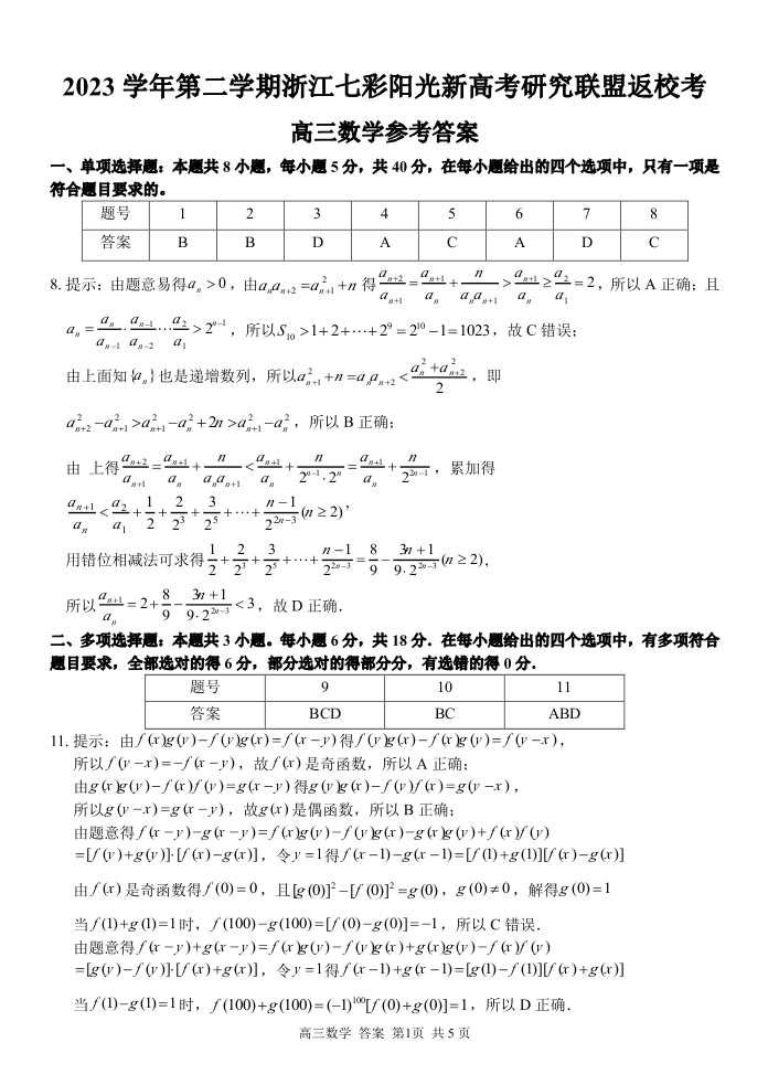 浙江省七彩阳光新高考研究联盟2023-2024学年高三下学期开学考试 数学答案