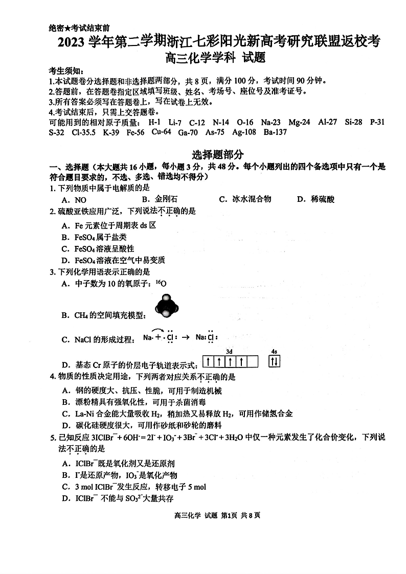 浙江省七彩阳光新高考研究联盟2023-2024学年高三下学期开学考试 化学