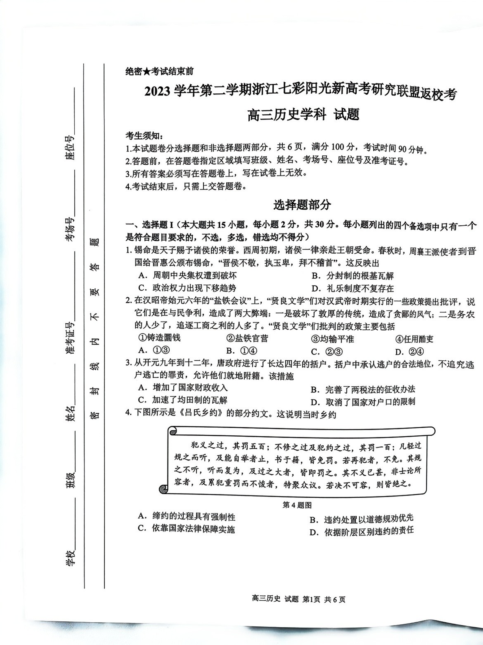 浙江省七彩阳光新高考研究联盟2023-2024学年高三下学期开学考试 历史