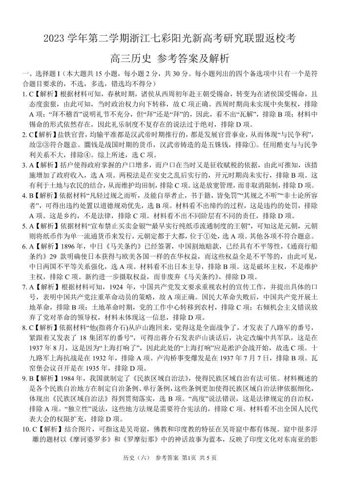 浙江省七彩阳光新高考研究联盟2023-2024学年高三下学期开学考试 历史答案