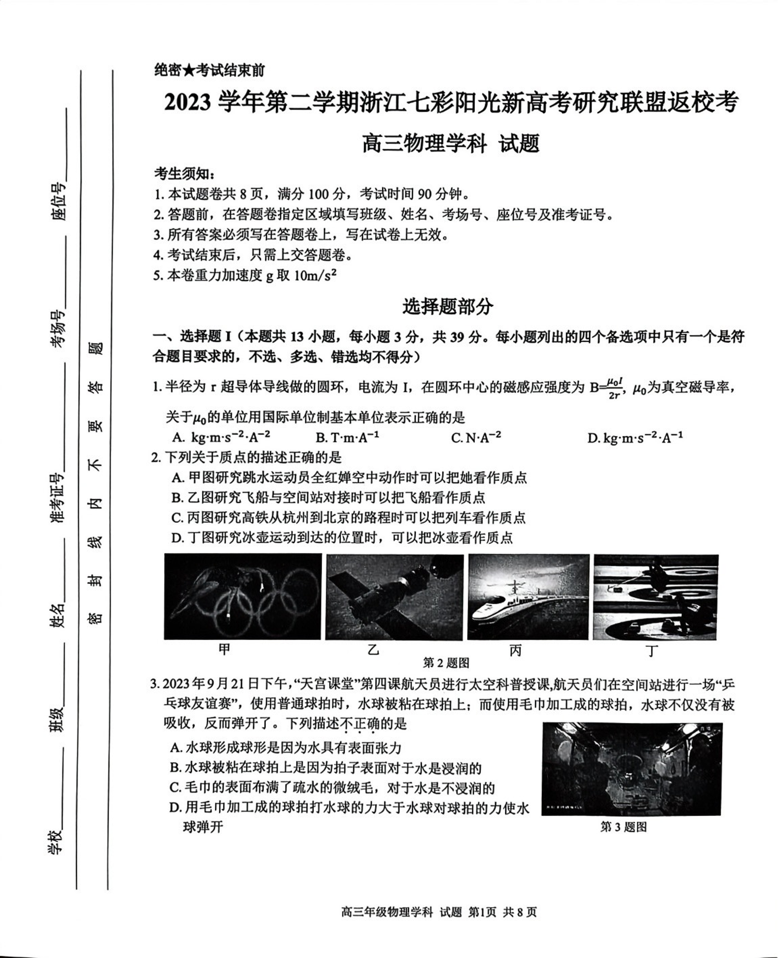 浙江省七彩阳光新高考研究联盟2023-2024学年高三下学期开学考试 物理