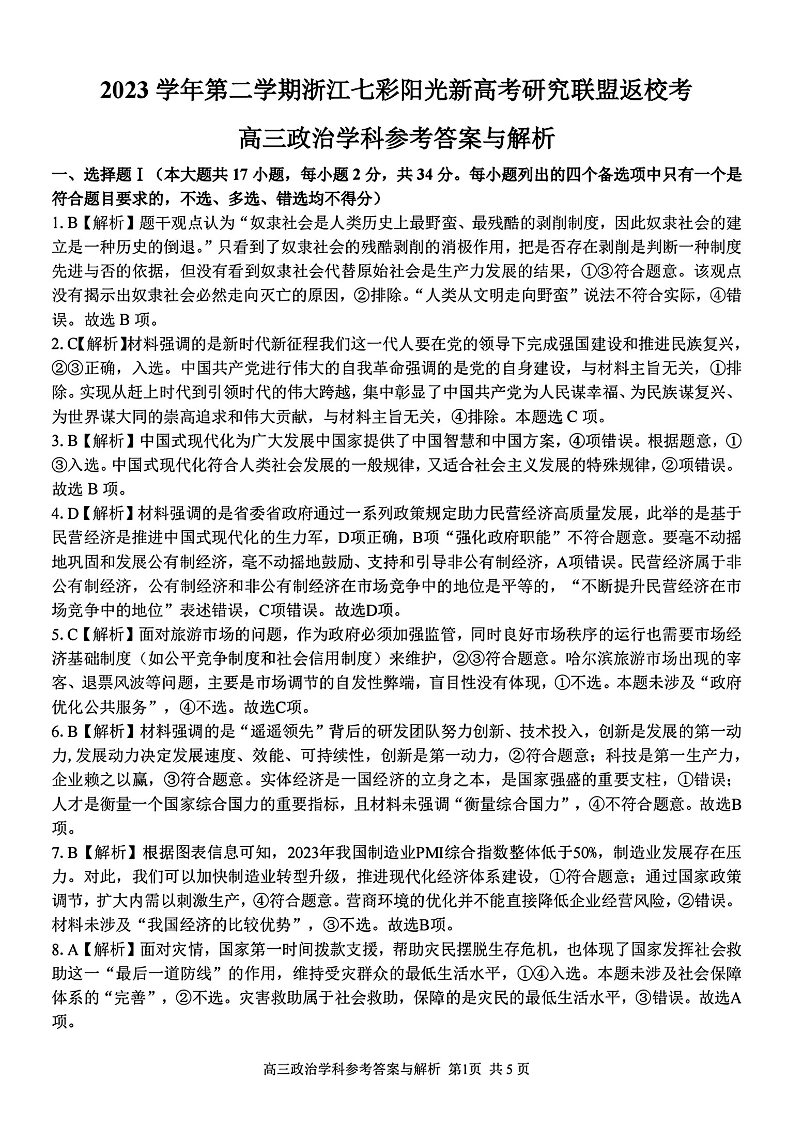 浙江省七彩阳光新高考研究联盟2023-2024学年高三下学期开学考试 政治答案