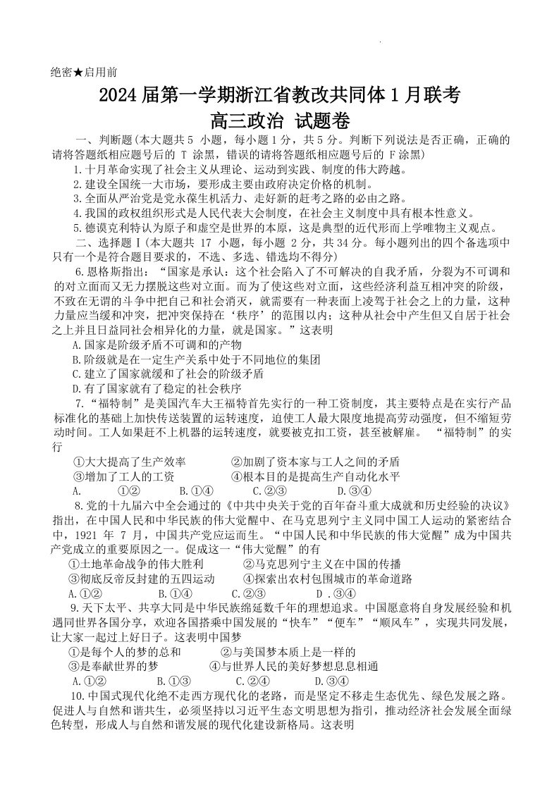 2023学年第一学期浙江省七校教研共同体调研测试 政治