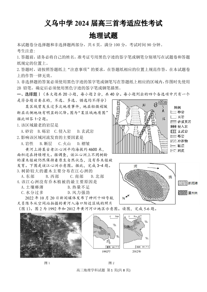 浙江省义乌中学2023-2024学年高三上学期首考适应性考试 地理