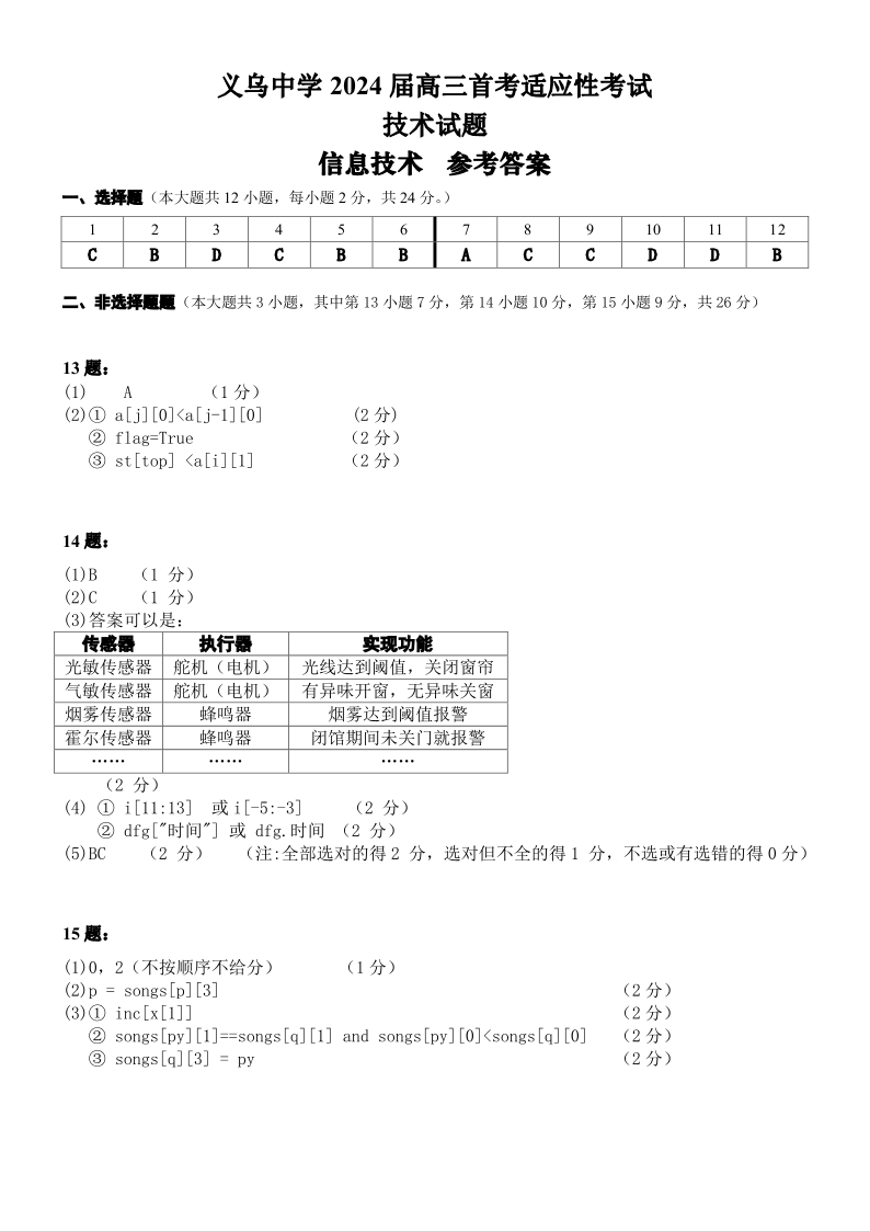 浙江省义乌中学2023-2024学年高三上学期首考适应性考试 技术答案
