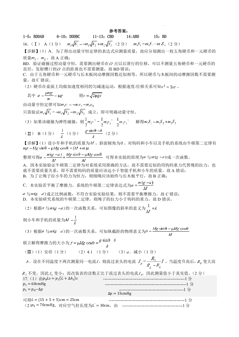 浙江省义乌中学2023-2024学年高三上学期首考适应性考试 物理答案