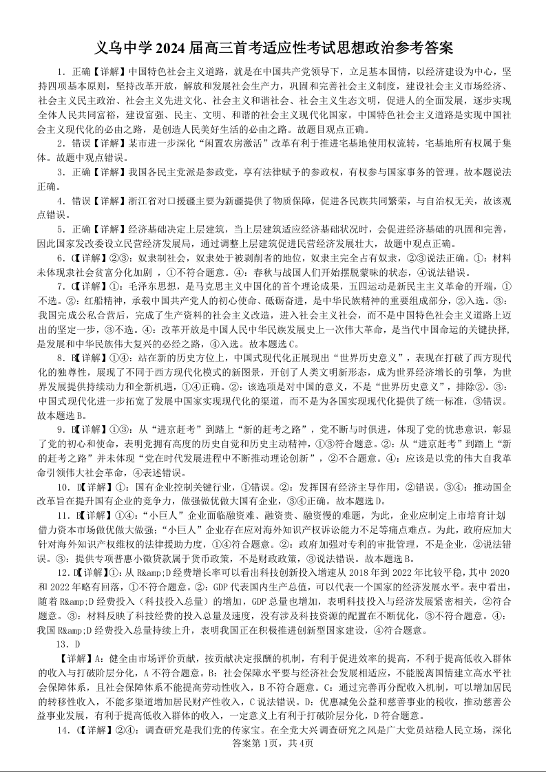 浙江省义乌中学2023-2024学年高三上学期首考适应性考试 政治答案
