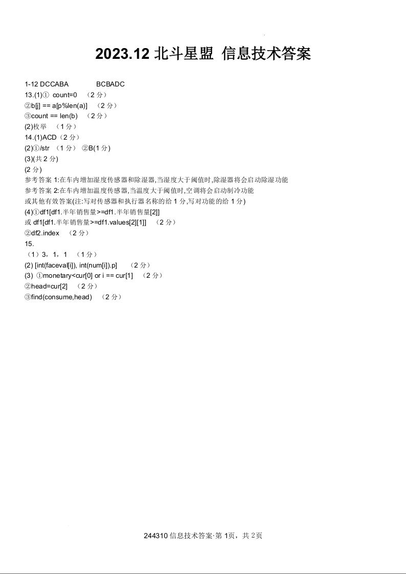 浙江省北斗星盟2023-2024学年高三上学期12月适应性考试 信息技术答案