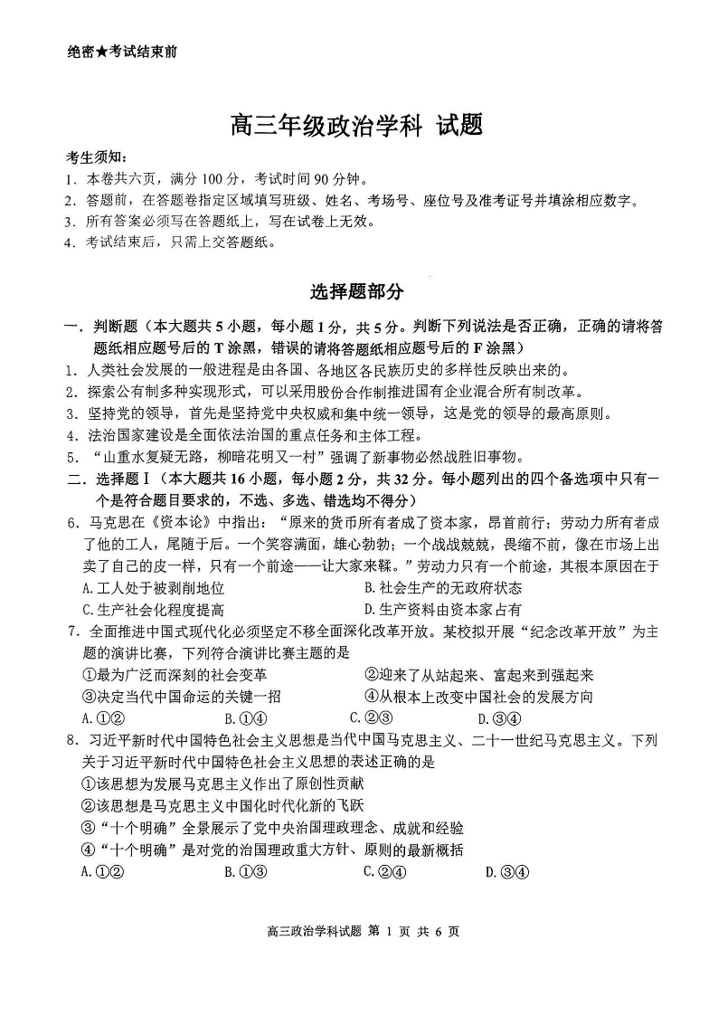 浙江省北斗星盟2023-2024学年高三上学期12月适应性考试 政治