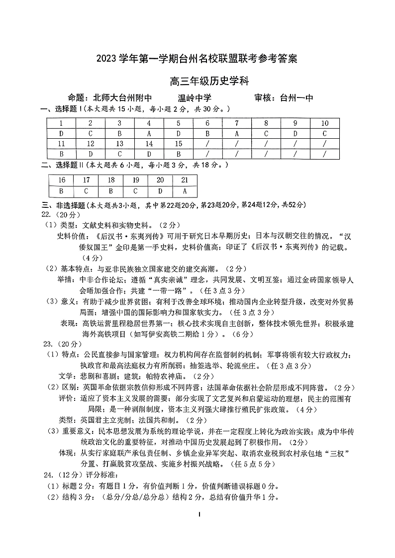 浙江省台州名校联盟2023-2024学年高三上学期联考 历史答案