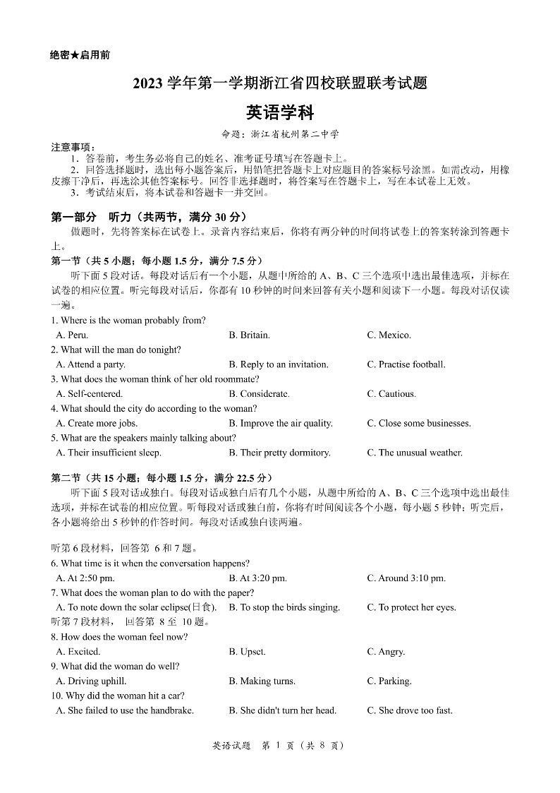 浙江省2023年12月高三四校联考 英语
