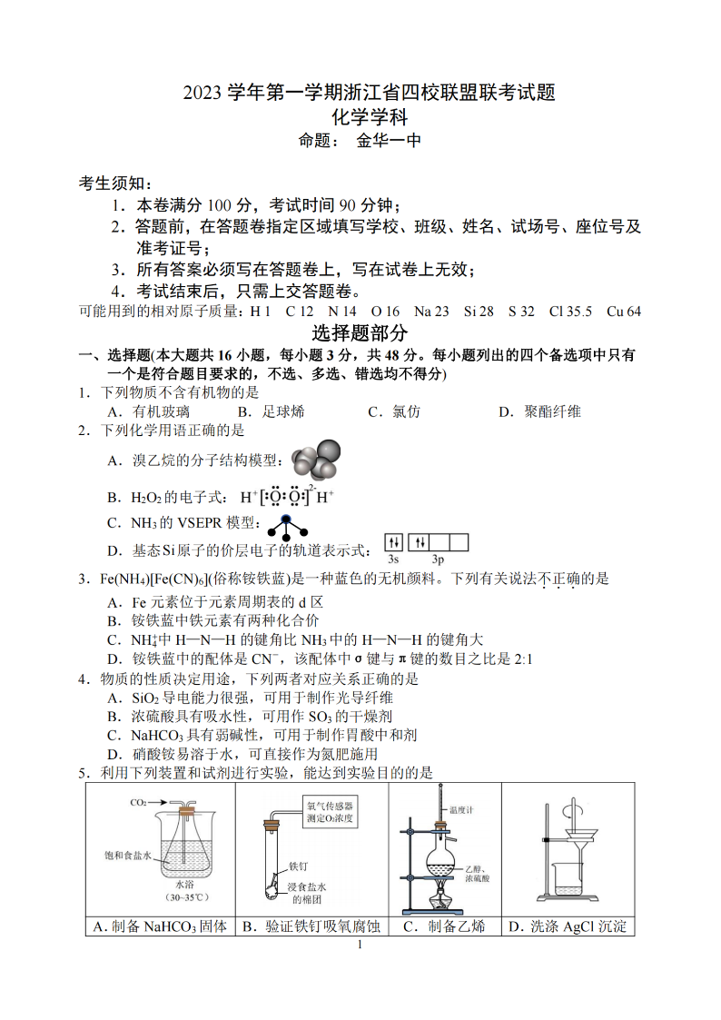 浙江省2023年12月高三四校联考 化学