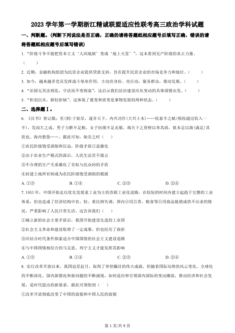 2023学年第一学期浙江省精诚联盟高三适应性12月联考 政治