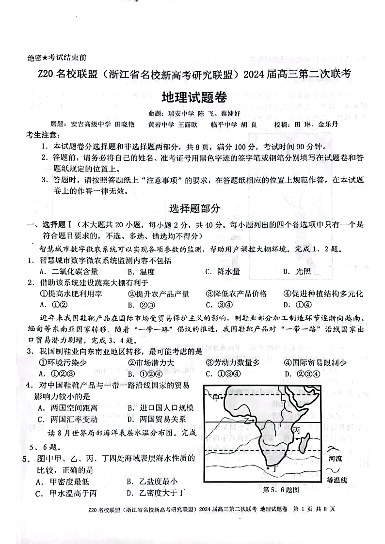 浙江省Z20名校联盟2023-2024学年高三上学期12月月考 地理