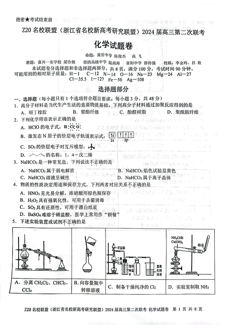 浙江省Z20名校联盟2023-2024学年高三上学期12月月考 化学