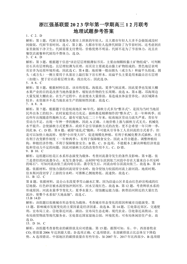 浙江强基联盟2023-2024学年第一学期高三12月联考 地理答案