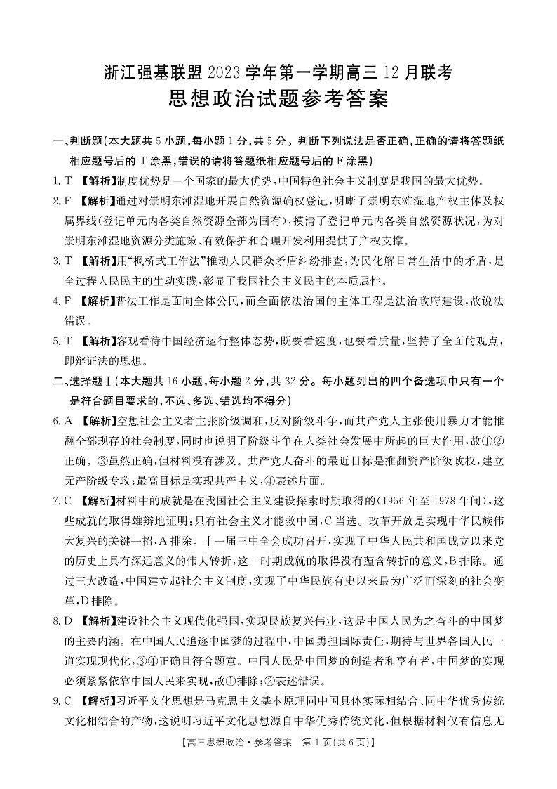 浙江强基联盟2023-2024学年第一学期高三12月联考 政治答案