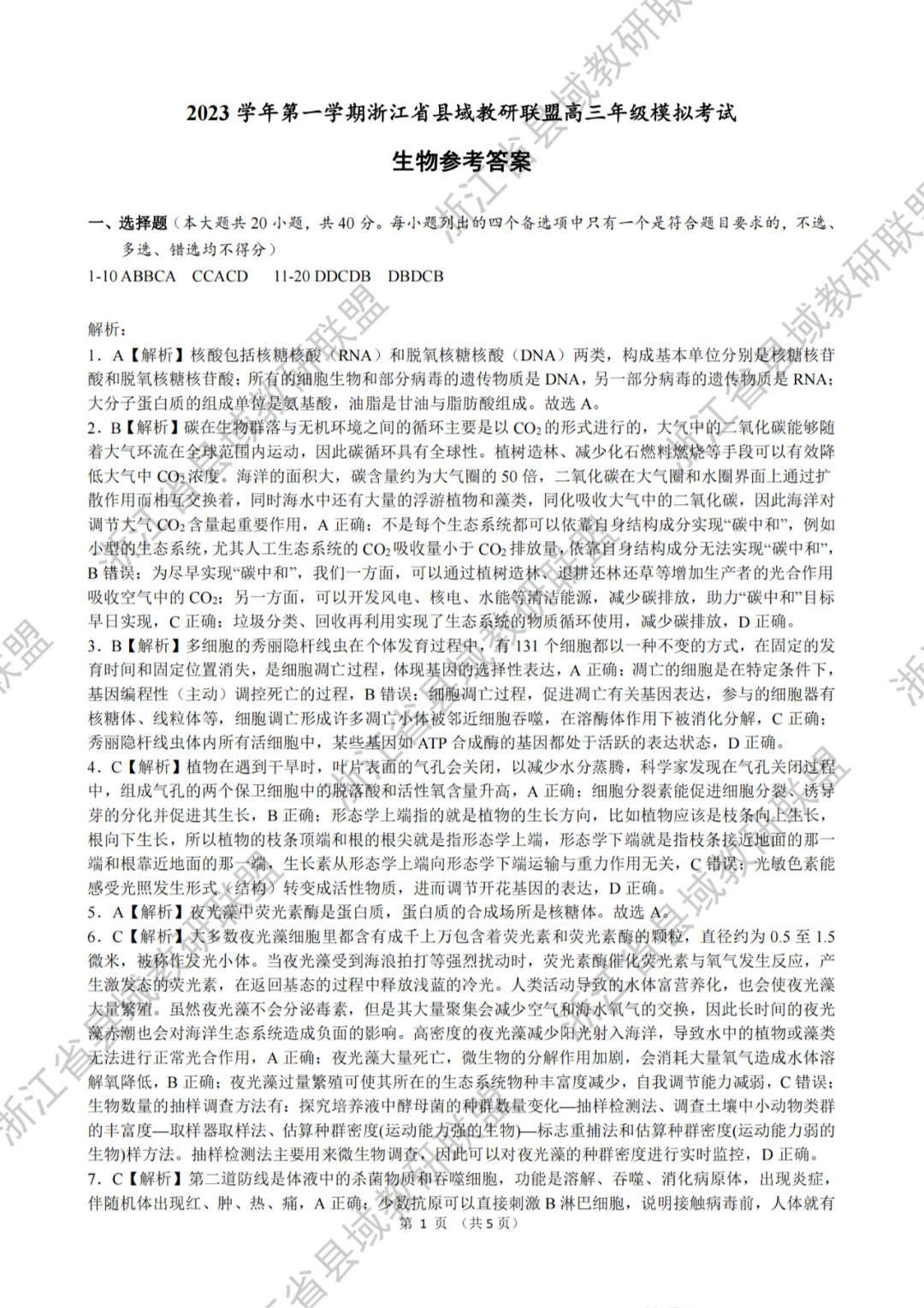 2023学年第一学期浙江省县域教研联盟高三年级模拟考试 生物答案