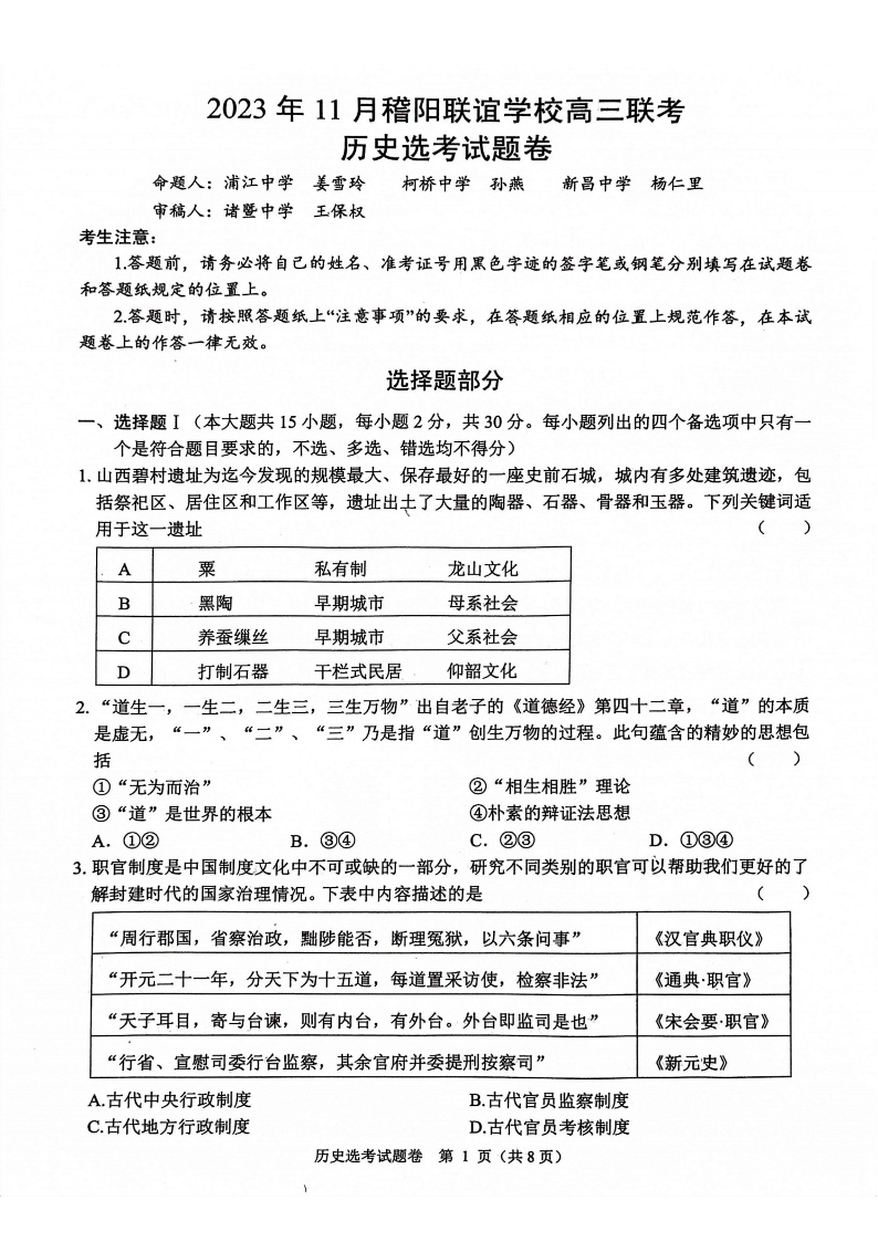 浙江省稽阳联谊学校2023-2024学年高三上学期11月联考 历史
